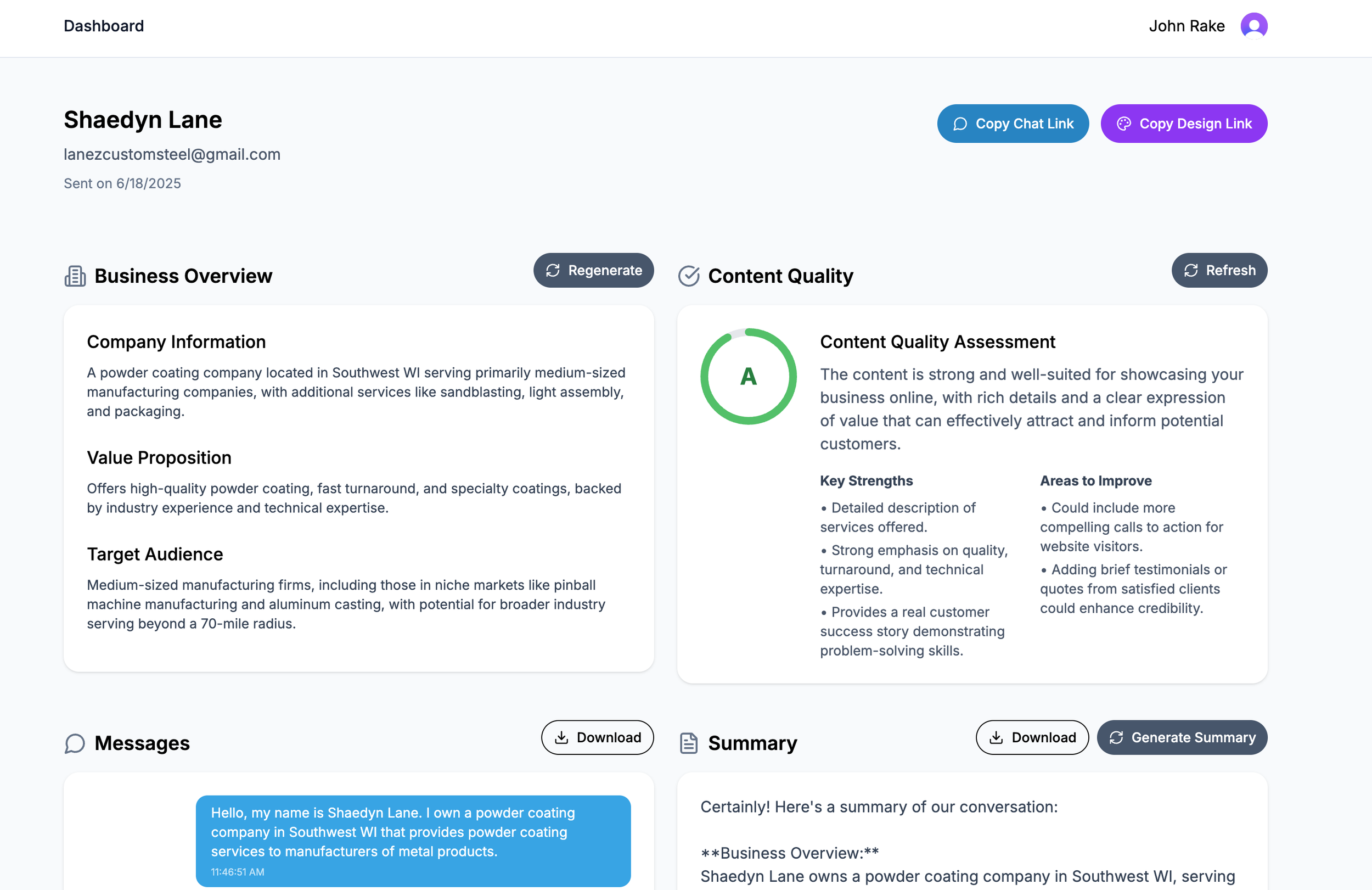 The platform goes beyond conversation by automatically generating sitemaps from client conversations, providing content quality assessments, including SEO checking tools, and offering a comprehensive designer handoff dashboard. Everything is organized in one place—business overview, brand guidelines, content quality scores, and sitemap structure—eliminating the need for designers to hunt through conversations or compile information manually. The entire process happens asynchronously, so clients can complete intake on their own time while designers can focus on other work.